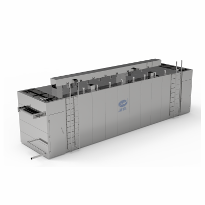 设备主要⽤于⾁制品、⾖制品等休闲⻝品,主要对产品进⾏烘⼲/烘烤、⻛冷(选配⼯艺段),烘⼲采⽤蒸汽换热器进⾏换热,烘烤采⽤远红外线进⾏加热,产品在烘⼲区域、烘烤区域进⾏往返连续式输送,以达到所需要⼯艺时间,整体加热过程为⾃动检测温度恒温,⾃动检测湿度排湿,内部⻛能⾃动循环,节约能耗,选配⼯艺段